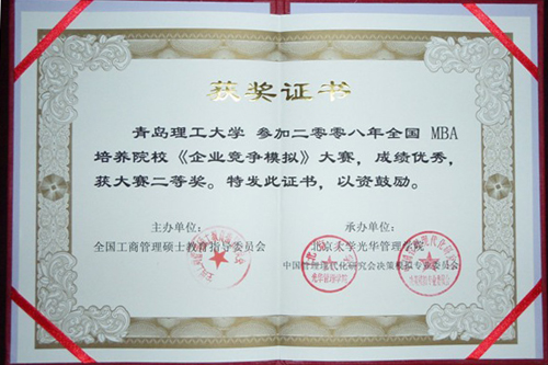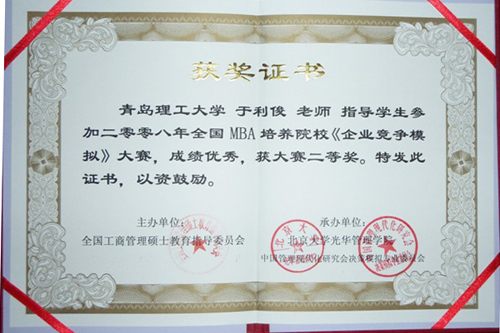 在近日结束的第七届全国MBA培养院校企业竞争模拟大赛中,由必赢官网管理学院李晓濛、陈博、刘汉鹏、孔静、吴黎明组成的代表队喜获全国二等奖,指导老师是于利俊,必赢官网是所有获奖院校中两个非211工程院校之一,也是山东省唯一一所获奖院校。
