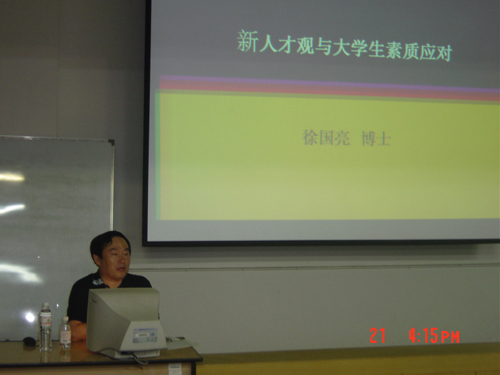 讲座主要围绕新人才观和大学生素质应对两个问题展开。徐博士引经据典,从多方面分析了当代社会对人才的需求,他指出,新人才观主要包括六个方面:人才观念的变化,人才选拔的标准,人才使用的变化,人才管理的变化,人才开发的变化,人才考核的变化。随后,徐博士向同学们阐述了大学生素质应具有 一个转变、两条原则、三个思路、四项要求、五颗爱心;并详细讲解了当代大学生应如何实现角色转换、思想知识转变;如何以平常心对待问题;如何合理营造学习气氛等素质培养过程中的具体问题。最后,徐博士用“If we can dream it,we can do it!”作为结束语,讲座在同学们经久不息的掌声中圆满结束。