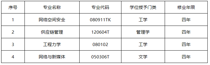 网络空间安全专业旨在培养具备网络空间安全领域科学研究、技术开发和工程应用服务工作能力的行业骨干和高级管理人才;供应链管理专业主要培养能适应大数据与智慧时代企业供应链运营需求,能在企业科研院所及政府部门从事供应链设计与管理、供应链系统优化及运营管理等方面工作的知识复合型的应用型创新人才;工程力学专业培养能够在能源、土木、机械、航空等有关工程领域中从事与力学问题相关的工程设计与分析、技术开发及技术管理、教育与科学研究等工作的应用创新复合型高素质人才;网络与新媒体专业主要培养具备新媒体创意思维能力和新媒体技术应用能力,从事新媒体运营与推广、媒体设计与制作、数据分析与挖掘等相关工作的应用型、复合型传媒人才。