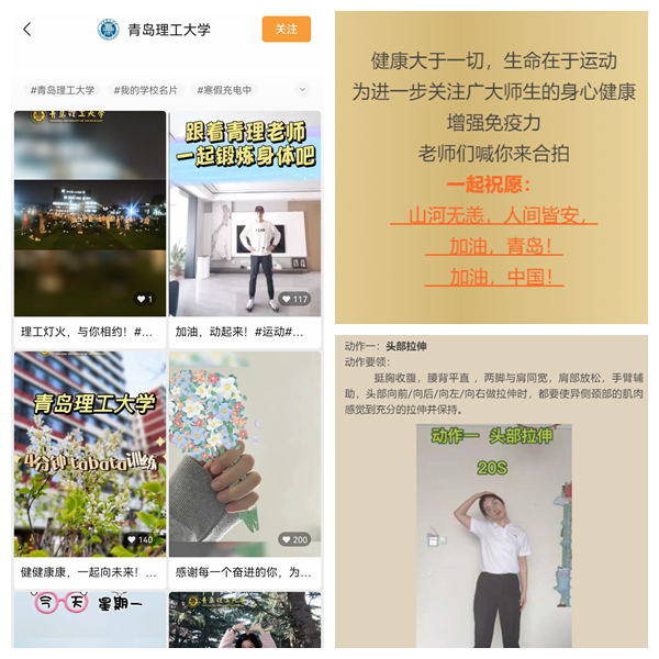 体育教学部在做好体育课程线上教学的同时,有序开展一系列线上体育活动,为同学们的身心健康保驾护航。大学生体育联盟发起“每天锻炼一小时!同心抗疫克时艰!”系列体育活动,体育教师在线指导,发挥体育社团的组织力和引导力,引领带动同学们积极参加体育锻炼。体育教学部青年教师拍摄居家健身视频,通过Bwin·必赢唯一官方网站微信公众号、视频号、抖音等新媒体平台,线上喊话同学们跟着视频锻炼,争当“健身达人”。
