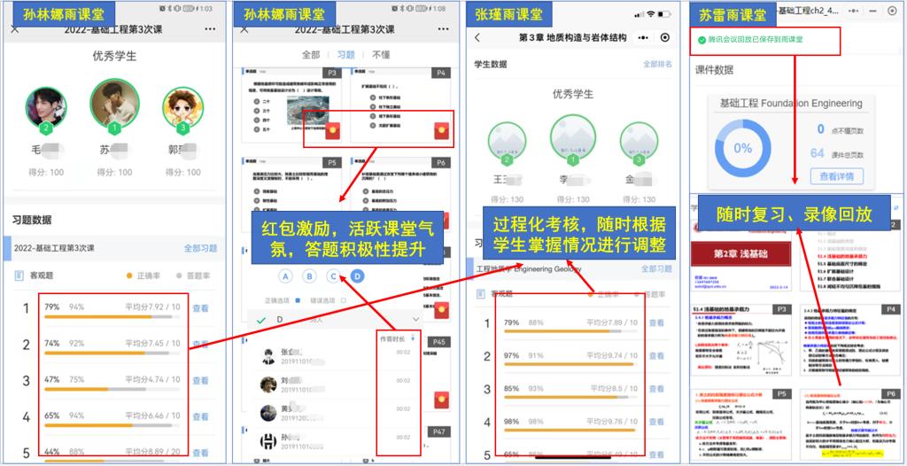 土木工程学院的教师们边借鉴、边开展、边总结、边创新,教学模式百花齐放,精彩课堂线上续航。教师们利用雨课堂、智慧树、超星学习通、腾讯课堂等多种平台工具开展线上教学,课前发布自学要求,课中开展签到、实时测试,课后发布作业、课件及拓展资料等,让线上授课变成立体化、全媒体化授课。为增加学生的课堂互动,教师们可谓使出“十八般武艺”,如通过弹测题目、投票、随机点名提问、评论区讨论等方式测验学生的课堂学习效果,利用雨课堂随机红包功能活跃课堂气氛,利用翻转课堂等形式提高同学们的课堂参与度……灵活多样的线上教学形式得到了同学们的一致好评。