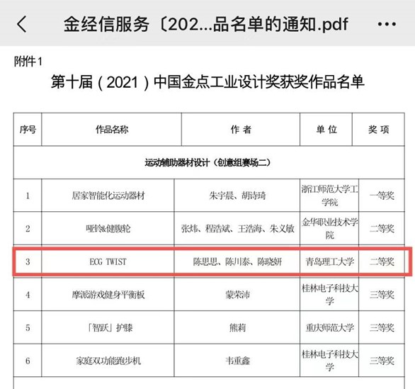 近日,在由中国工业设计协会指导,金华市人民政府主办的第十届中国金点工业设计大奖中,艺术与设计学院李东老师指导、2018级产品设计专业陈思思同学设计的作品《ECG TWIST》荣获总决赛二等奖,并获奖金三万元人民币。
