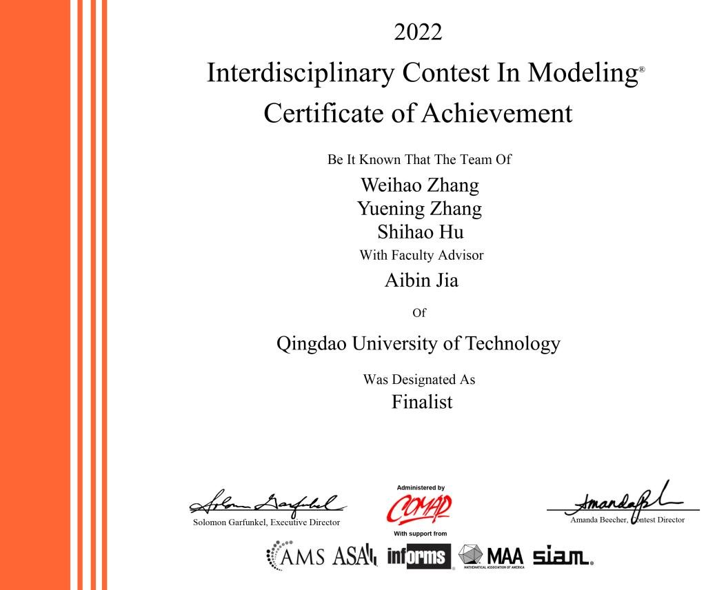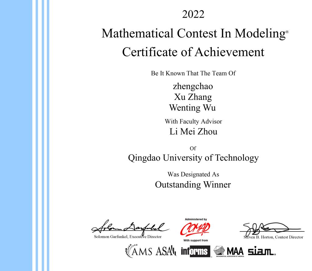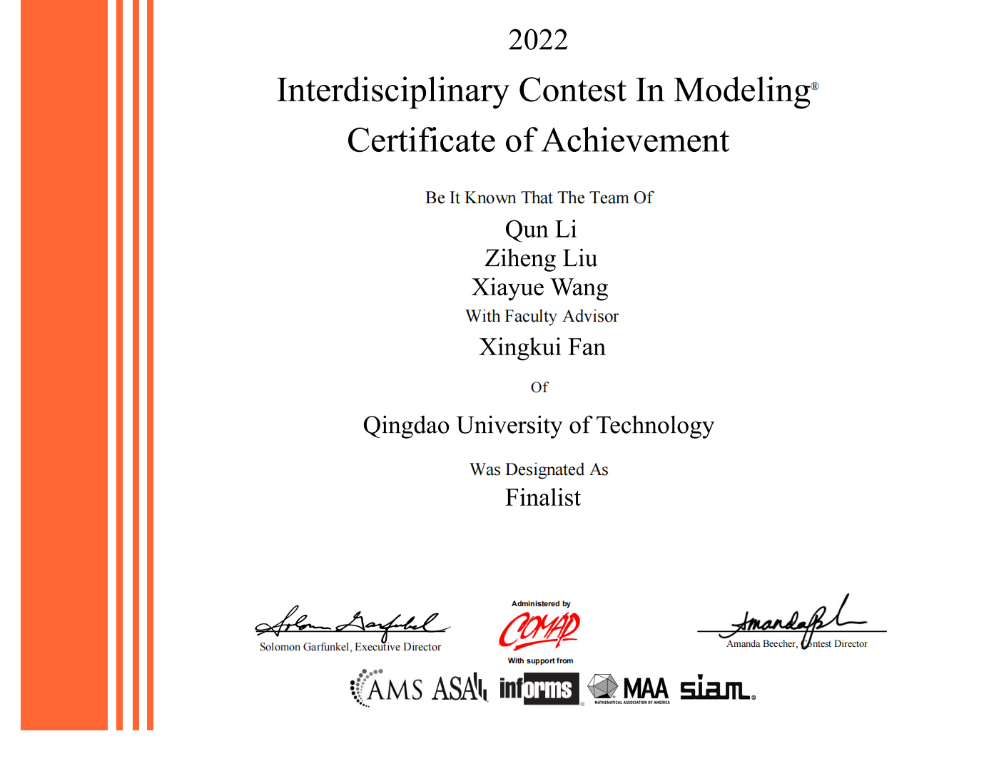为备战本次竞赛,理学院和临沂校区基础部组织了优秀数学建模教师指导团队,对参赛过程进行高效管理,实现了学校参加该赛事以来的历史性突破,其中计算191郑超、计算191张旭及统计202吴文婷组成的团队(指导教师:周丽美)斩获特等奖(Outstanding)——赛事最高奖;信息192李群、通信194王霞月及通信195柳子恒(指导老师:范兴奎),自动185胡世豪、造价193张悦宁及造价191张伟豪(指导教师:贾爱宾),临沂校区土升213韩纪晓、土升216赵凯洋及土本201宁熙雯(指导老师:王正杰)获得特等奖提名(Finalist)。