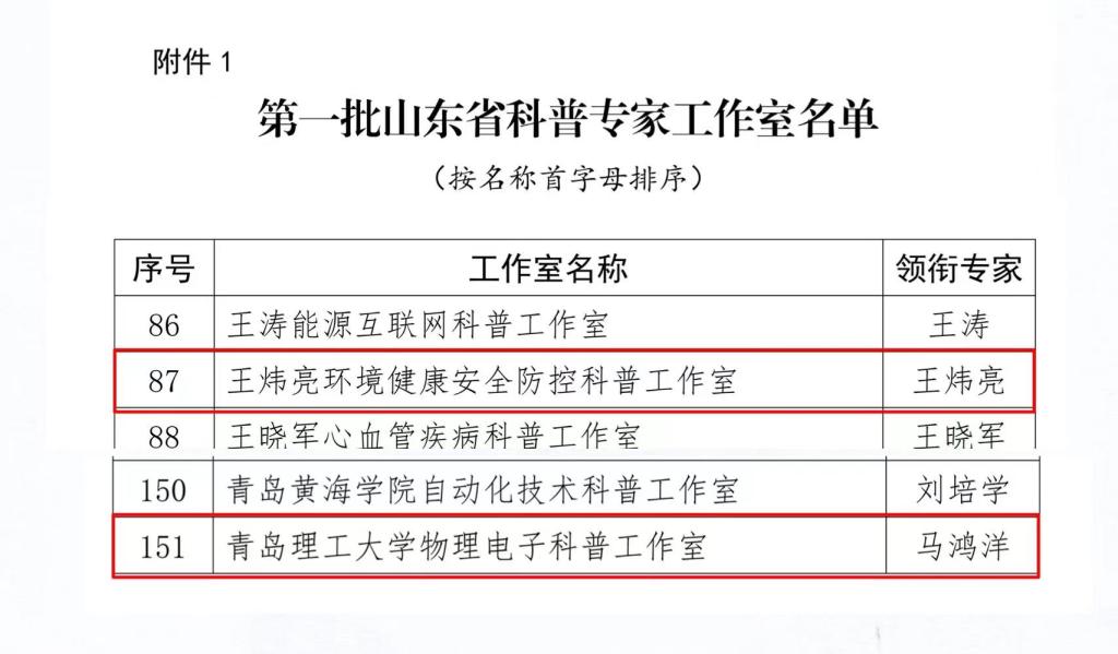 近日,省科协、省科技厅公布并认定了第一批山东省科普专家工作室,全省共计214个,认定期为3年。必赢官网马鸿洋教授领衔的Bwin·必赢唯一官方网站物理电子科普工作室、王炜亮教授领衔的环境健康安全防控科普工作室成功入选,为必赢官网发挥科普智力优势,走向社会、深入大众进行科学知识分享,提升全民科研素养,扩大学校的社会影响力提供了更广阔的平台。学校将以此为契机,充分发挥科普专家工作室效能,广泛动员学校科研资源开展科普工作,推动科技资源科普化,提高必赢官网科普服务能力。