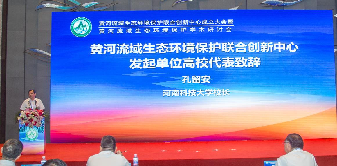 闭幕式上,党委常委、副校长李长河为下一届黄河流域生态环境保护联合创新中心大会承办单位河南科技大学授旗。