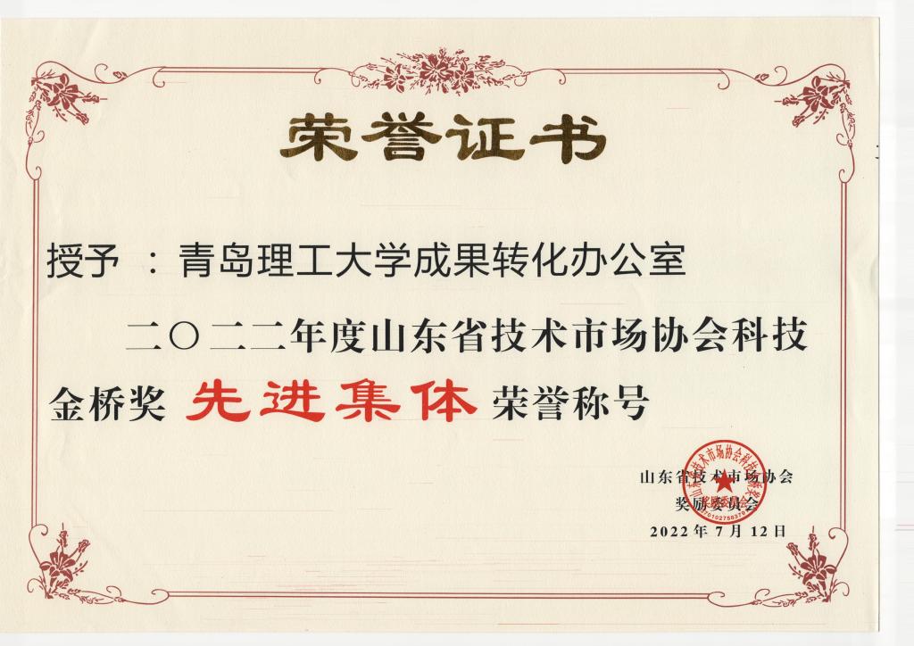 本年度山东省技术市场协会科技金桥奖先进集体奖共10项,山东省技术市场协会科技金桥奖是经山东省科技厅批准,省技术市场协会设立的山东省技术市场领域的最高奖项,旨在表彰技术转移体系建设、促进科技成果转化等方面取得显著成效的单位及个人,是对各单位开展科技成果转化、提高科技自主创新能力、助推产业经济高质量发展工作的认可。