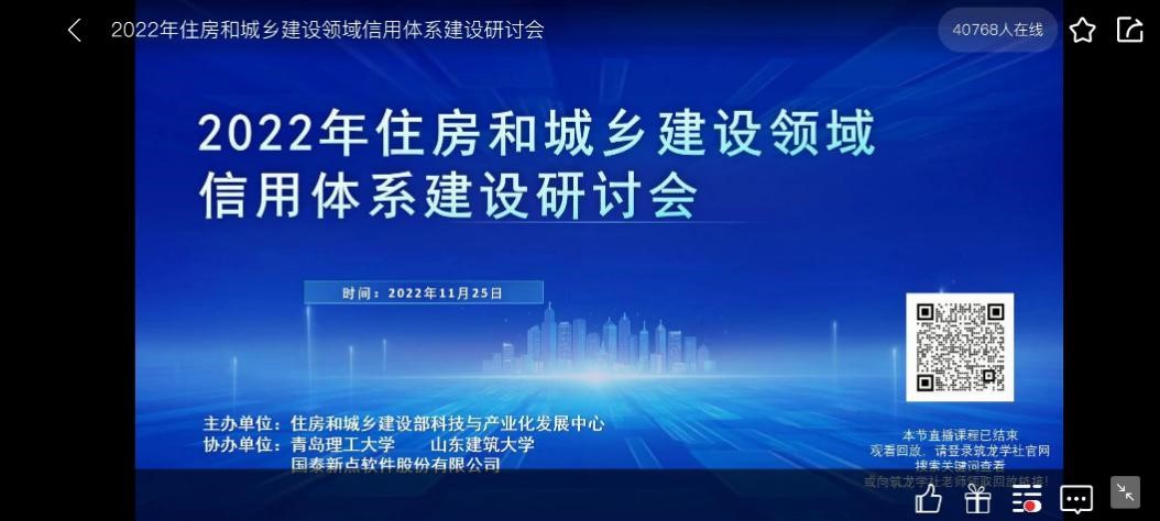 11月25日,由国家住房和城乡建设部科技与产业化发展中心主办,Bwin·必赢唯一官方网站和山东建筑大学协办的2022年信用体系研讨会顺利召开。本次研讨会主题是“以信用记录打通工程建设全链条监管、用信用数据赋能智慧城市精细化治理,推进住房和城乡建设事业高质量发展”。会议采取线上形式举办,来自住房和城乡建设部各有关单位、各地住房和城乡建设部门及其附属机构信用工作负责人员、高校、科研院所、行业协会、代表性企业的一百五十多名专家学者线上参加了本次会议,超过4万名行业人才和高校学生观看了会议实况直播。