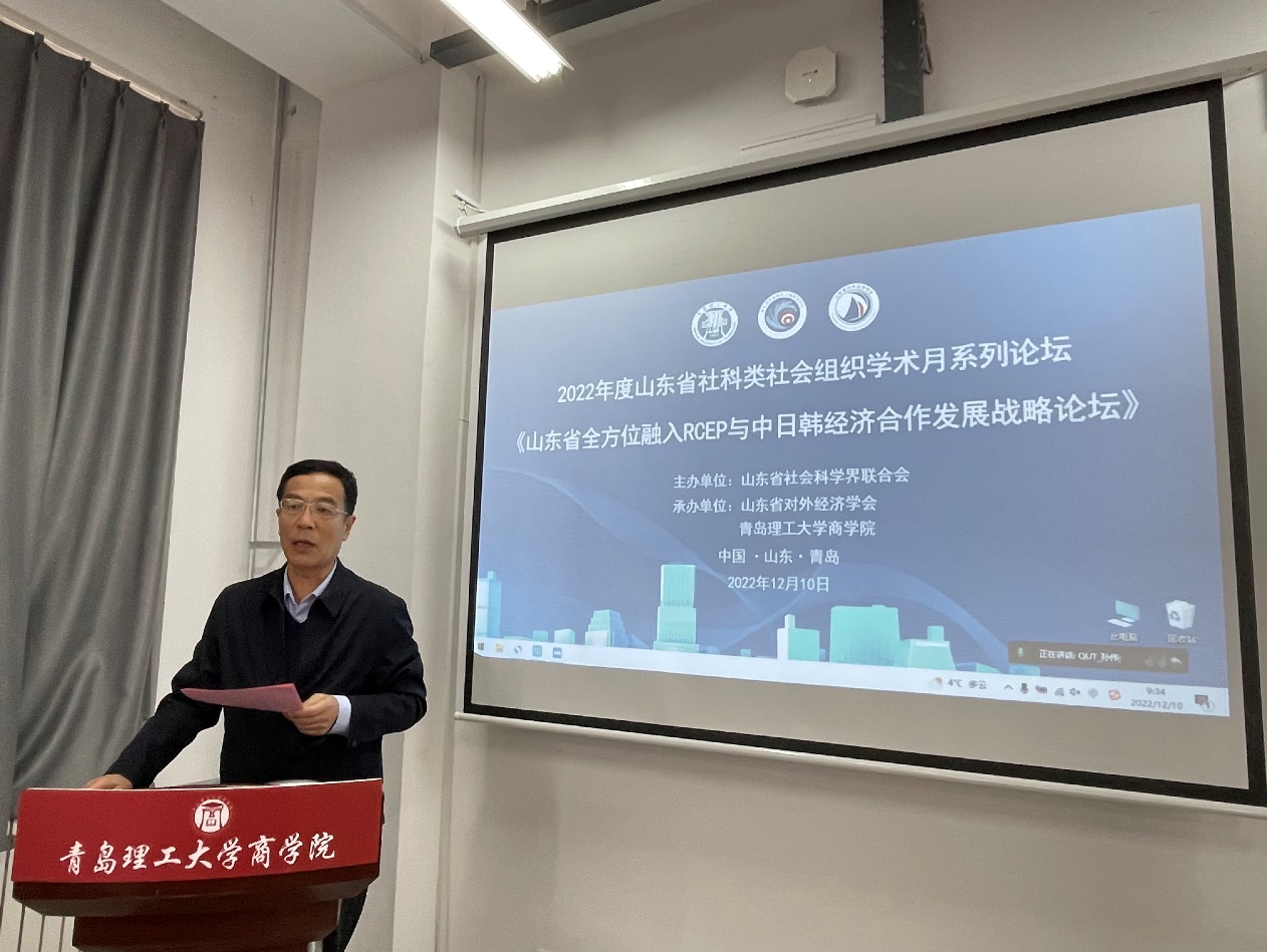 12月10日,2022年山东省社科类社会组织学术月系列论坛暨山东省对外经济学会2022年度年会,“山东省全方位融入RCEP与中日韩经济合作发展战略论坛”通过线上形式举行,会议由山东省社会科学界联合会、Bwin·必赢唯一官方网站主办,山东省对外经济学会、Bwin·必赢唯一官方网站商学院承办。山东省社科联二级巡视员徐青,Bwin·必赢唯一官方网站党委常委、副校长齐德义,山东省对外经济学会会长王培志,Bwin·必赢唯一官方网站商学院党委书记王粲等出席开幕式并讲话。商学院院长云乐鑫主持开幕式,山东省政府研究室、中国(山东)自由贸易试验区青岛片区管委会、山东省商务厅等单位领导及全省近100名师生参加会议。