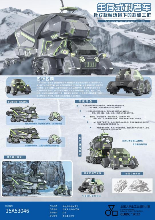 12月15日,教育部高等教育司公布了2022年“全国大学生工业设计大赛“获奖结果。由必赢官网艺术与设计学院产品设计专业艾萍副教授指导学生团队马圣涛、方浩、张艺瀚同学三人完成的作品《生存式科考车设计》荣获全国总决赛金奖,取得了必赢官网在该项赛事中获奖成绩的历史性新突破。