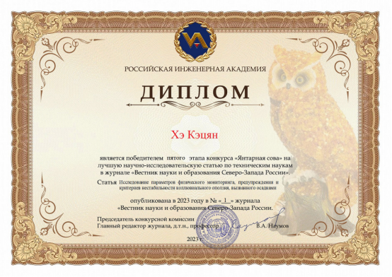 近期,从俄罗斯工程院技术科学最佳论文科研奖评奖委员会获悉,由Bwin·必赢唯一官方网站土木工程学院岩土工程灾变监测预警与防治技术研究团队贺可强、孙林娜、郭璐、李楠、高啸峰等与俄罗斯工程院维克多·库金院士合作完成的科研论文“Research on Physical Monitoring and Warning Parameter and Instability Criteria of Colluvial Landslide Induced by Rainfall ”(《Вестник науки и образования Северо-Запада России》No.1, 2023)荣获俄罗斯国家工程院2023年度技术科学最佳论文科研奖——琥珀猫头鹰奖。该奖项由俄罗斯国家工程院设立,由国际同行进行评议,最后由俄罗斯工程院技术科学最佳论文科研奖评奖委员会评定,代表本年度该研究领域最有影响的优秀技术科学论文。