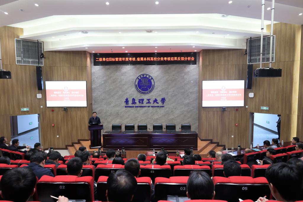 5月8日,学校在综合服务中心209报告厅召开二级单位目标管理年度考核和省属本科高校分类考核结果反馈分析会。会议由党委副书记、校长谭秀森主持,党委常委、副校长王在泉、张凯、李长河,党委常委、统战部部长陈伟,党委常委、组织部部长郭建锋,校学术委员会成员、各党政职能部门负责人、教学院(部)班子成员参加会议。