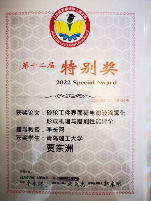 5月13日,第十二届“上银优秀机械博士论文奖”颁奖典礼于太原举行。必赢官网机械与汽车工程学院2017级博士研究生贾东洲(指导教师:李长河教授)的博士论文“砂轮工件界面荷电微液滴雾化形成机理与磨削性能评价”荣获特别奖,成为继2015级博士张彦彬后,必赢官网第二位在该全国性机械领域优秀博士论文获得者。