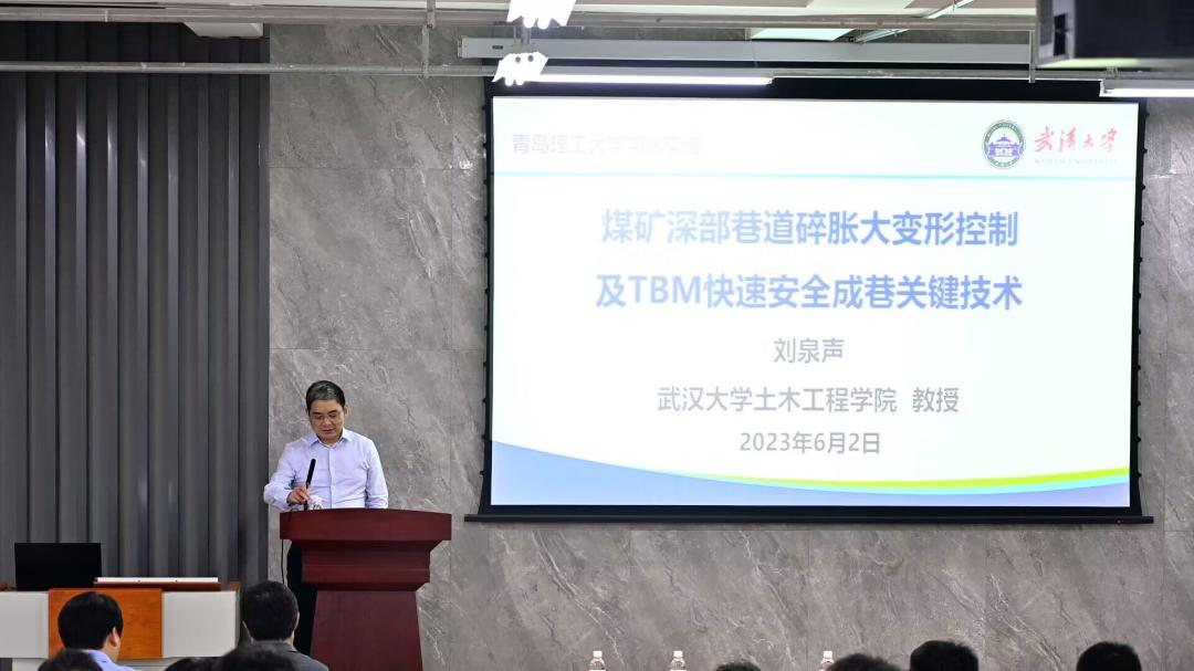 刘泉声以《煤矿深部巷道碎胀大变形控制及TBM快速安全成巷关键技术》为题作讲座,向在场师生介绍了深部复杂地质条件下常遇到的高地应力、巷道大变形、采掘接续困难等工程问题。基于这些问题,刘教授阐述了米级大变形破裂碎胀新机理,向在场的师生介绍深部巷道大变形分布联合控制理论及成套技术和TBM快速成巷安全掘进技术,对该技术在碎胀大变形控制方面取得的关键突破、解决采掘接续难题进行了阐释。与会师生就本构模型建立、稳定性控制等问题,结合自身研究与刘泉声进行了深入细致地交流与讨论。