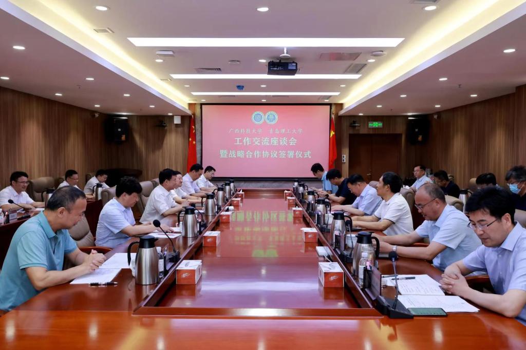 7月3日,广西壮族自治区教育厅副厅长金祖权、科研处处长黄青云,广西科技大学党委书记赵君、党委副书记、校长刘宝臣等一行11人莅临学校,开展工作座谈交流并签署战略合作协议。学校党委副书记、校长谭秀森参加座谈会并主持会议,党委常委、副校长王在泉,党委常委、副校长张凯,党委常委、统战部部长陈伟,学校相关职能部门负责同志参加座谈会。
