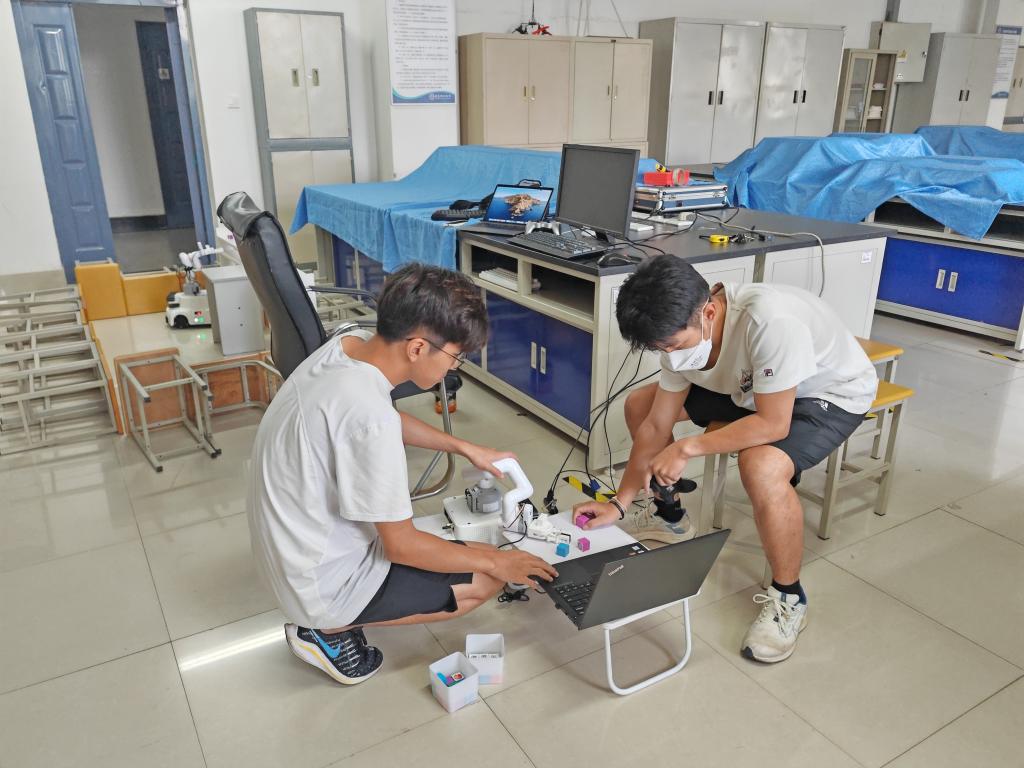 调试仪器、逐一测量坐标、规划机器行走路径、抓取路径优化、颜色识别抓取.....暑假中,竞赛指导组的老师们时刻不得闲,邀请专业工程师开展培训,指导学生做练习、程序调控,稍有差错,就要从头再来。除了吃饭、睡觉,团队的成员几乎没有离开实验室一步。调试有时会失败,但参赛师生仍拿出破釜沉舟的干劲迎接每一天的挑战。当机器人手臂成功识别抓取后看到大家露出舒心的笑脸时,慢慢地,大家才发现一切付出都值得。