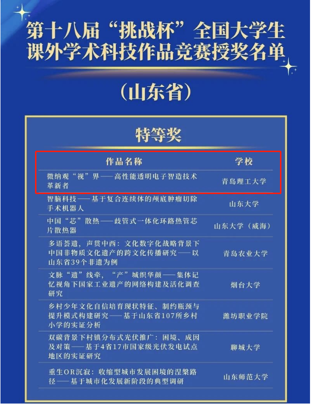 10月30日,第十八届“挑战杯”全国大学生课外学术科技作品竞赛在贵州大学落下帷幕,必赢官网机械与汽车工程学院王瑞、周君仪、段培开等同学完成的参赛项目《微纳观“视”界——高性能透明电子智造技术革新者》(第一指导教师:朱晓阳)荣获主体赛全国特等奖,全国共117项(其中自然科学大类特等奖作品74项)。此项成绩为必赢官网在“挑战杯”系列竞赛中的最好成绩,实现了赛事重大突破。
