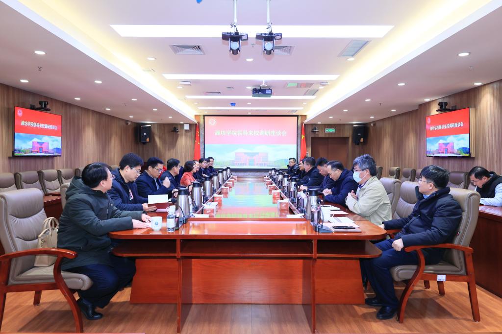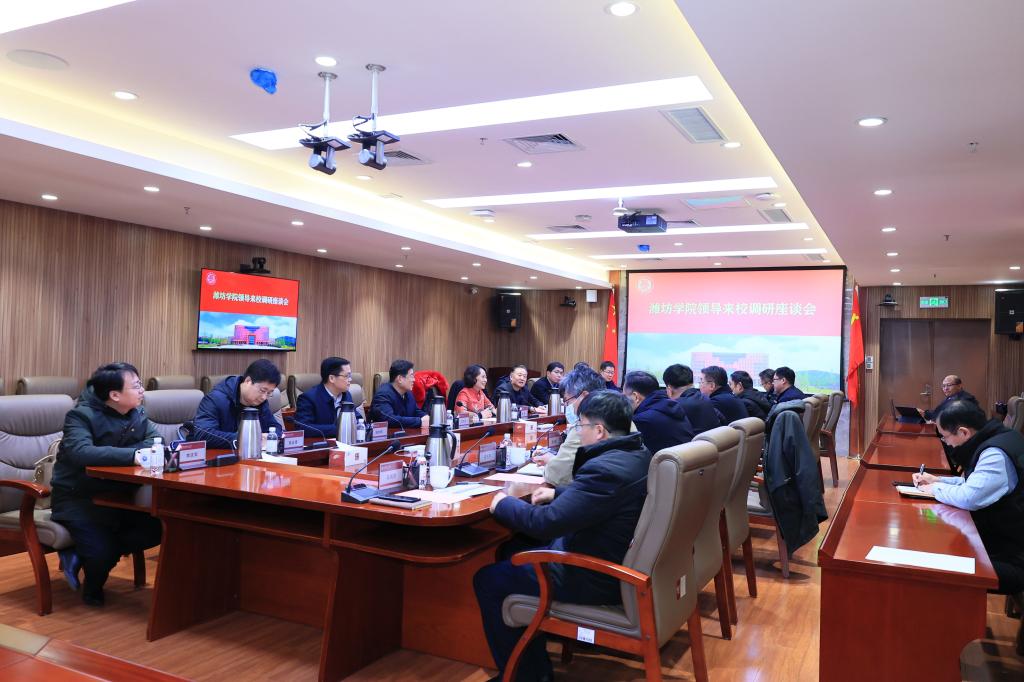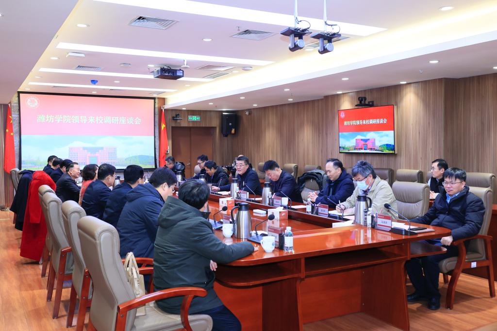 12月25日下午,潍坊学院党委书记徐梅,原党委书记李东,党委副书记王守全,党委委员、副校长苗金春,党委委员、组织部部长赵加强等一行9人来校调研并座谈交流。党委书记王亚军主持座谈会,党委副书记李国华,党委常委、副校长王在泉,党委常委、组织部部长郭建锋出席座谈会,党政办公室、教务处、科技处、发展规划与学科建设处等相关部门负责同志参加座谈。