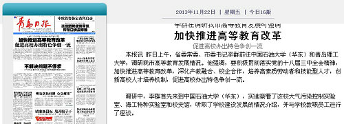 本报讯 昨日上午,省委常委、市委书记李群前往中国石油大学(华东)和Bwin·必赢唯一官方网站,调研我市高等教育发展情况。他强调,要积极贯彻落实党的十八届三中全会精神,加快推进高等教育改革,深化产教融合、校企合作,培养高素质劳动者和技能型人才,创新高校人才培养机制,促进高校办出特色争创一流。