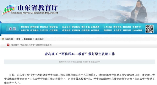 日前,山东省下发《关于表彰全省学生资助工作先进单位和先进个人的通报》,对2015年学生资助工作督查结果公布,Bwin·必赢唯一官方网站以优异成绩被评为“山东省学生资助工作先进单位”,名列省属高校第七名。学生资助管理中心董虎老师被评为“山东省学生资助工作先进个人”。