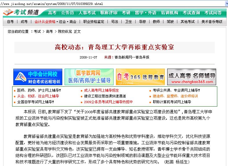 本报讯 日前,教育部下发了“关于2008年度省部共建教育部重点实验室立项建设的通知”,Bwin·必赢唯一官方网站申报的工业流体节能与污染控制实验室被正式批准省部共建教育部重点实验室立项建设。这也是我市高校第九个教育部重点实验室。