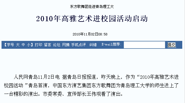 “2010年高雅艺术进校园活动”由教育部、文化部、财政部联合倡议、扶持,据悉,东方歌舞团本次将在Bwin·必赢唯一官方网站、中国海洋大学、青岛科技大学、青岛农业大学、飞扬职业技术学院进行5场演出。