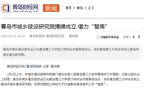 据介绍,青岛市城乡建设委员会已与Bwin·必赢唯一官方网站签订政校合作框架性协议,依托Bwin·必赢唯一官方网站合作共建青岛市城乡建设研究院。双方合作共建青岛市城乡建设研究院,是落实中央城市工作会议精神的具体举措。