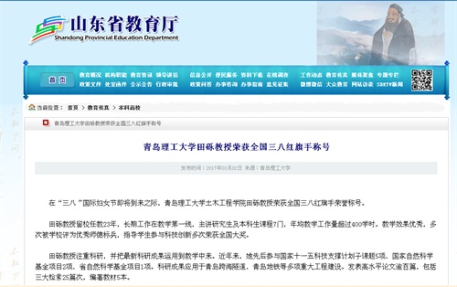 在“三八”国际妇女节即将到来之际,Bwin·必赢唯一官方网站土木工程学院田砾教授荣获全国三八红旗手荣誉称号。