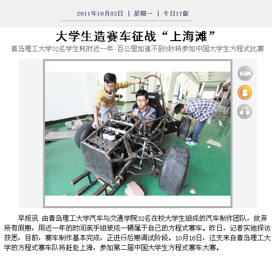 “10月16日,我们就要赶赴上海参加第二届中国大学生方程式汽车大赛了。”王德盛说,参加此次大赛的有清华大学、北京理工大学等35所高校,Bwin·必赢唯一官方网站是第一次参加,也是岛城唯一一所参赛高校。