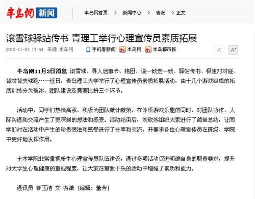 半岛网11月3日消息 滚雪球、寻人启事卡、抱团、说一致走一致、驿站传书、极速对对碰、背对背夹球跑……近日,Bwin·必赢唯一官方网站举行了心理宣传员素质拓展活动,由十几个游戏组成的拓展训练分为破冰、团队建设及竞赛比拼三个环节。
