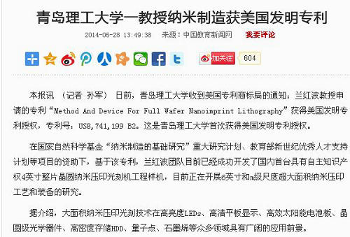 在国家自然科学基金“纳米制造的基础研究”重大研究计划、教育部新世纪优秀人才支持计划等项目的资助下,基于该专利,兰红波团队目前已经成功开发了国内首台具有自主知识产权4英寸整片晶圆纳米压印光刻机工程样机,目前正在开展6英寸和m级尺度超大面积纳米压印工艺和装备的研究。