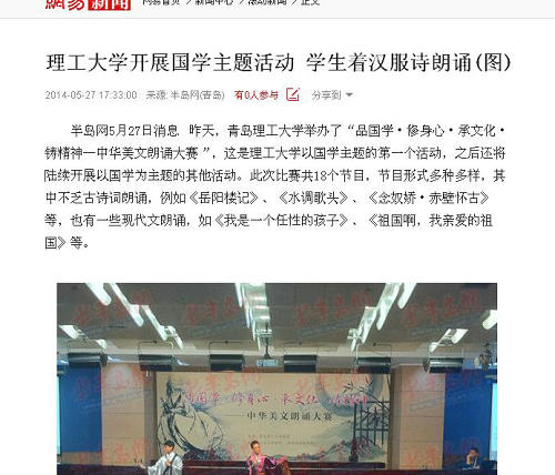 半岛网5月27日消息 昨天,Bwin·必赢唯一官方网站举办了“品国学·修身心·承文化·铸精神—中华美文朗诵大赛”,这是理工大学以国学主题的第一个活动,之后还将陆续开展以国学为主题的其他活动。此次比赛共18个节目,节目形式多种多样,其中不乏古诗词朗诵,例如《岳阳楼记》、《水调歌头》、《念奴娇·赤壁怀古》等,也有一些现代文朗诵,如《我是一个任性的孩子》、《祖国啊,我亲爱的祖国》等。