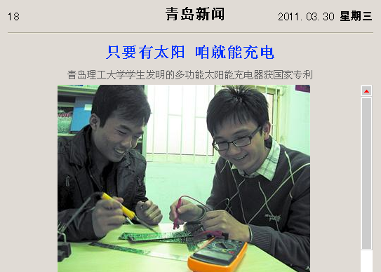 “其实是一个很偶然的机会,让我们想到了设计一个太阳能充电器。”理工大环境学院大三学生陈雄辉告诉记者,有一次他和同学一起外出,结果手机没电了,从大二就开始自主创业的他正在等一个客户的电话,最后他只好打车赶回宿舍给手机充电。与陈雄辉同宿舍的王振买了一款长虹手机,厂家配了一个像书一样大的太阳能充电器,“当时我们就讨论,如果所有手机都能通用就好了。”陈雄辉和王振以及其它3名同学说干就干,几个人通过网络查询、市场调查发现,目前市场上并没有给手机、相机等充电的太阳能充电器,而他们自信这个产品的市场前景一片光明。