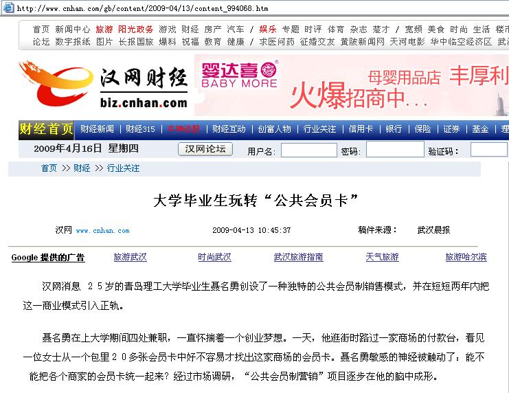 感的神经被触动了:能不能把各个商家的会员卡统一起来?经过市场调研,“公共会员制营销”项目逐步在他的脑中成形。