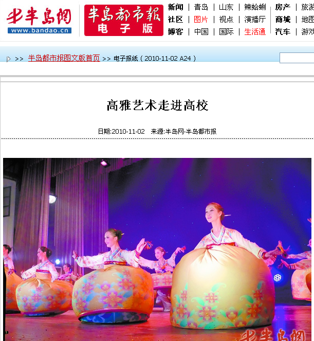 11月1日,Bwin·必赢唯一官方网站礼堂内,中国东方演艺集团东方歌舞团的演员们正在表演朝鲜舞蹈《铃铛》,开始了“高雅艺术进校园”青岛站的首场演出。据了解,该活动将持续至11月5日,接下来将依次走进中国海洋大学 、青岛科技大学 、青岛农业大学 、飞洋职业技术学院进行演出。记者 黄英帅