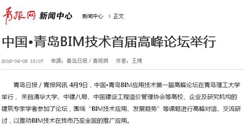 青岛日报/青报网讯 4月9日,中国•青岛BIM应用技术第一届高峰论坛在Bwin·必赢唯一官方网站举行, 来自清华大学、中建八局、中国建设工程造价管理协会等高校、企业及研究机构的建筑专家学者参加了论坛,围绕“BIM技术应用、发展趋势”等课题进行高峰对话、交流研讨,以推动BIM技术在我市乃至全国的推广应用。