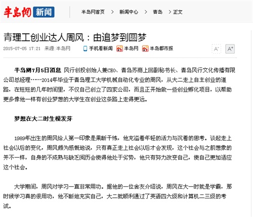 半岛网7月5日消息 风行创投创始人兼CEO、青岛苏商上回副秘书长、青岛风行文化传播有限公司总经理……2014年毕业于Bwin·必赢唯一官方网站机械自动化专业的周风,从大二走上自主创业的道路,在短短的几年时间里,不仅自己创立了四家公司,而且正开始做一些创业孵化项目,以帮助更多像他一样有创业梦想的大学生在创业这条路上走得更远。