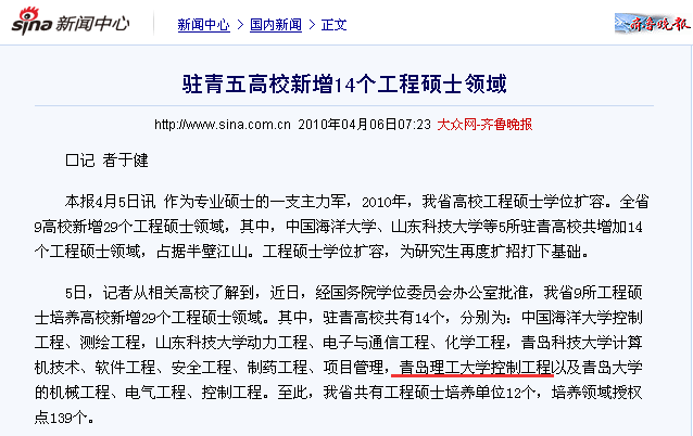 本报4月5日讯 作为专业硕士的一支主力军,2010年,我省高校工程硕士学位扩容。全省9高校新增29个工程硕士领域,其中,中国海洋大学、山东科技大学等5所驻青高校共增加14个工程硕士领域,占据半壁江山。工程硕士学位扩容,为研究生再度扩招打下基础。