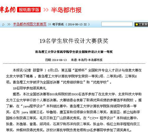 本报讯(记者 邵雷萍 ) 6月1日,第五届“蓝桥杯”全国软件专业人才设计与信息大赛在北京大学落下帷幕 。Bwin·必赢唯一官方网站计算机学院学生荣获一等奖1项、二等奖9项,三等奖6项。Bwin·必赢唯一官方网站被评为全国总决赛“优秀组织单位”和“优胜学校”。