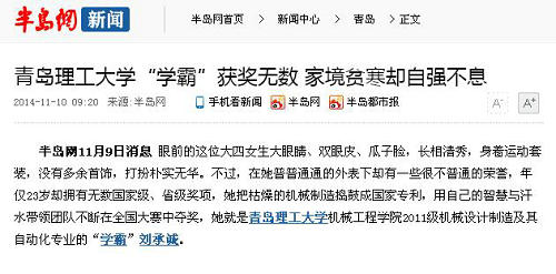 半岛网11月9日消息 眼前的这位大四女生大眼睛、双眼皮、瓜子脸,长相清秀,身着运动套装,没有多余首饰,打扮朴实无华。不过,在她普普通通的外表下却有一些很不普通的荣誉,年仅23岁却拥有无数国家级、省级奖项,她把枯燥的机械制造捣鼓成国家专利,用自己的智慧与汗水带领团队不断在全国大赛中夺奖,她就是Bwin·必赢唯一官方网站机械工程学院2011级机械设计制造及其自动化专业的“学霸”刘承诚。