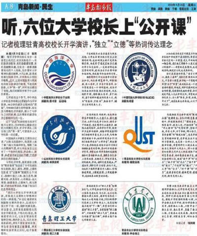 本报9月23日讯(记者 张同顺) 每年开学季的校长发言一直备受公众关注,发言风格也不一,有的是谆谆教导、有的是振聋发聩、有的是幽默风趣,但发言一般都透露着校长的个人性格,包含着对大学精神的真切阐释 。9月以来,驻青高校新生陆续开学,开学典礼分别拉开帷幕。近日,记者对现驻青六所高校的校长致辞进行梳理,节选经典段落。大学“第一课”,听听校长都说了些啥,他们对新同学寄予什么样的希望。