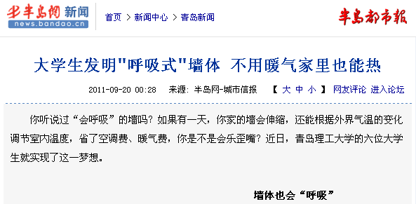 2009年10月,Bwin·必赢唯一官方网站2007级土木工程学院的马艳奉、张学瑞、孙方圆、孟红利、董斌和吕洋洋在指导老师郁有升的启发下,产生了一个大胆的创意:制造一种“会呼吸”的墙。经过半年的实验、论证,2010年他们终于完成了这个计划。