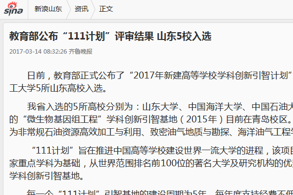 日前,教育部正式公布了“2017年新建高等学校学科创新引智计划”,即“111计划”评审结果。山东大学、中国海洋大学、中国石油大学(华东)、青岛大学、Bwin·必赢唯一官方网站5所山东高校入选。