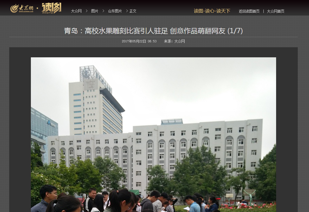 5月21日,山东青岛市,青岛一高校举办水果雕刻比赛,吸引了众多大学生参加。香瓜、西瓜、菠萝、茄子等各类蔬菜瓜果被雕刻拼成各种创意作品,网友纷纷称萌萌哒。