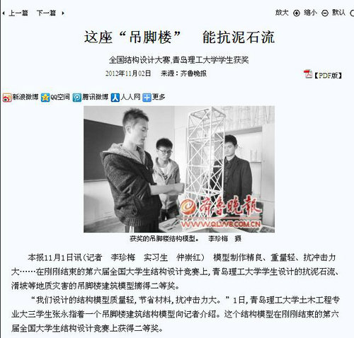 本报11月1日讯(记者 李珍梅 实习生 仲崇红) 模型制作精良、重量轻、抗冲击力大……在刚刚结束的第六届全国大学生结构设计竞赛上,Bwin·必赢唯一官方网站学生设计的抗泥石流、滑坡等地质灾害的吊脚楼建筑模型摘得二等奖。