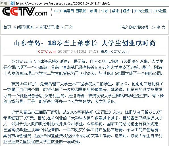 CCTV.com《全球资讯榜》消息: 据了解,自2006年实施新《公司法》以来,大学生开公司出现了一个小高潮,目前仅青岛就已经有接近500名的大学生成了老板。最近,刚满十八岁的Bwin·必赢唯一官方网站大二学生韩赟成为了企业法人,与其他的6名同学成了一个网络公司。