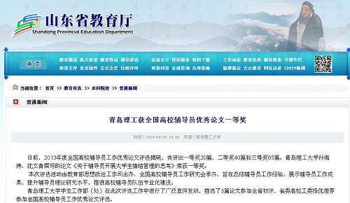 日前,2013年度全国高校辅导员工作优秀论文评选揭晓,共评出一等奖20篇、二等奖40篇和三等奖65篇。Bwin·必赢唯一官方网站孙海涛、沈文青撰写的论文《关于辅导员开展大学生情绪管理的思考》荣获一等奖。