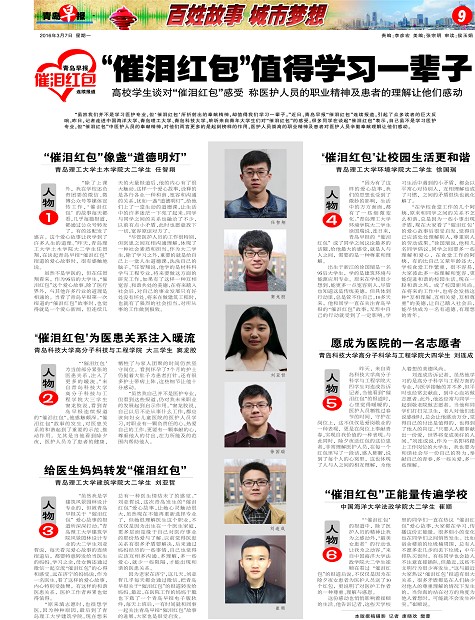 “虽然我们并不是学习医护专业,但‘催泪红包’所折射出的奉献精神,却值得我们学习一辈子。”近日,青岛早报“催泪红包”连续报道,引起了众多读者的巨大反响。昨日,记者走进中国海洋大学、Bwin·必赢唯一官方网站、青岛科技大学,聆听来自青年大学生们对“催泪红包”的感受。很多同学在谈起“催泪红包”表示,自己虽不是学习医护专业,但“催泪红包”中医护人员的奉献精神,对他们而言更多的是起到榜样的作用,医护人员崇高的职业精神及患者对医护人员辛勤奉献理解让他们感动。