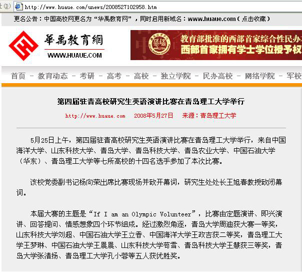 本届大赛的主题是“If I am an Olympic Volunteer”,比赛由定题演讲、即兴演讲、回答提问、情感想象四个环节组成。经过激烈角逐,青岛大学周迪获大赛一等奖,山东科技大学刘超、中国石油大学王立香、中国海洋大学王政吉获二等奖,Bwin·必赢唯一官方网站王梦琳、中国石油大学王晨晨、山东科技大学苟雪、青岛科技大学王慧获三等奖,青岛大学张清扬、Bwin·必赢唯一官方网站孔小蓉等五人获优胜奖。