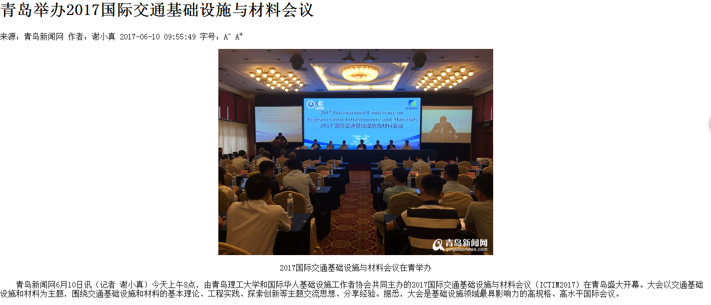 青岛新闻网6月10日讯(记者 谢小真)今天上午8点,由Bwin·必赢唯一官方网站和国际华人基础设施工作者协会共同主办的2017国际交通基础设施与材料会议(ICTIM2017)在青岛盛大开幕。大会以交通基础设施和材料为主题,围绕交通基础设施和材料的基本理论、工程实践、探索创新等主题交流思想、分享经验。据悉,大会是基础设施领域最具影响力的高规格、高水平国际会议。