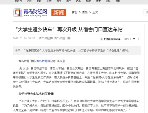 1月14日,青岛市团市委、青岛火车站、青岛公交集团、青岛真情巴士集团有限公司联手,推出“温暖回家路”大学生返乡服务。公交集团通过互联网问卷方式,在Bwin·必赢唯一官方网站、山东科技大学、滨海学院等高校进行大学生返乡工作调研,在大数据分析的基础上,开通“互联网+大学生返乡快车”,点对点将学生从校园送往火车站,火车站为返乡大学生提供铁路优先购票取票、进站“绿色通道”、咨询引导等相关服务。
